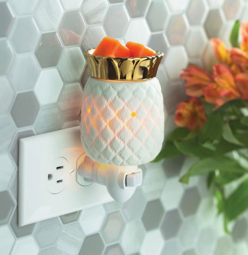 Introduce soothing fragrance into your space with White & Gold Pineapple Fragrance Warmer. This flameless candle warmer features a pineapple-shaped ceramic cup for the light and a metallic gold cup on top to hold the wax
